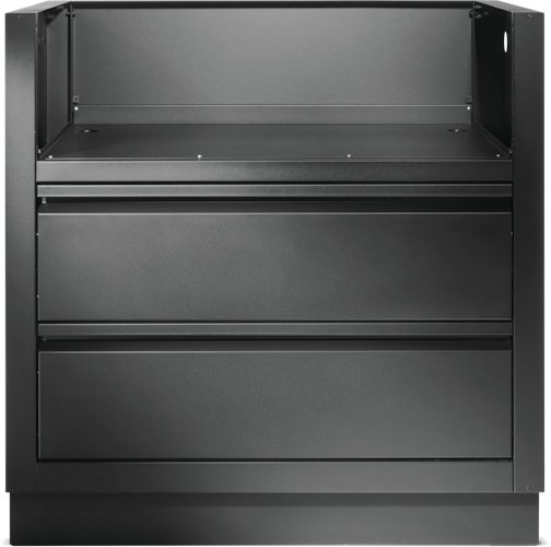 Speziell für die Einbau 700 Serie 32" Gasgrillaufsätze gefertigt, bietet dieses matt schwarze, pulverbeschichtete, galvanisierte Gehäuse erhöhte Haltbarkeit. Zwei Schubladen sind auf Soft-Close-Schienen montiert, um einen reibungslosen Zugriff auf den Stauraum unter dem Grill zu ermöglichen.