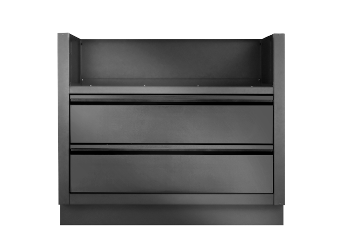 Speziell für die Einbau 700 Serie 38" Gasgrillaufsätze gefertigt, bietet dieses matt schwarze, pulverbeschichtete, galvanisierte Gehäuse erhöhte Haltbarkeit. Zwei Schubladen sind auf Soft-Close-Schienen montiert, um einen reibungslosen Zugriff auf den Stauraum unter dem Grill zu ermöglichen.