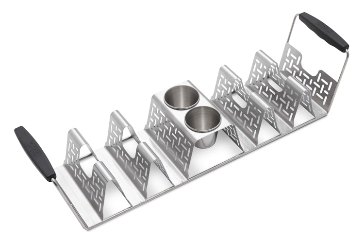 Bietet Platz für bis zu 6 Tacos. Das Gestell verfügt über Silikongriffe für bequemen Halt und ist spülmaschinenfest für eine einfache Reinigung. Langlebige Konstruktion aus Edelstahl, inklusive 2 praktischer Soßenbecher.